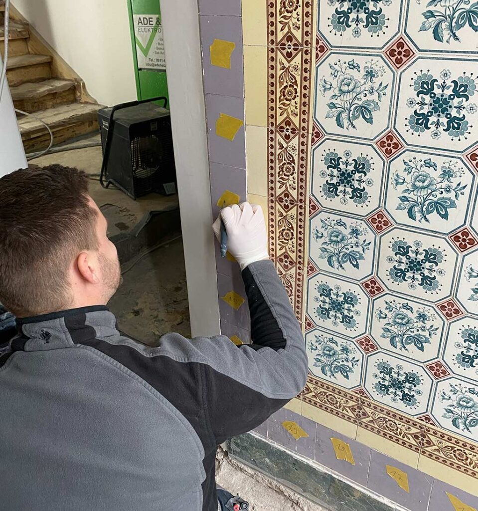 Bei einem anspruchsvollen Sanierungsprojekt in einem denkmalgeschützten Gebäude bestand unsere Aufgabe darin, die historischen Fliesen im Eingangsbereich einer ehemaligen Metzgerei vollständig zu restaurieren. Um die alte Ästhetik zu bewahren, haben