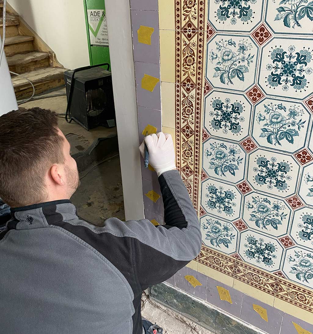 Bei einem anspruchsvollen Sanierungsprojekt in einem denkmalgeschützten Gebäude bestand unsere Aufgabe darin, die historischen Fliesen im Eingangsbereich einer ehemaligen Metzgerei vollständig zu restaurieren. Um die alte Ästhetik zu bewahren, haben wir jede einzelne Fliese sorgfältig entfernt, gereinigt und in der exakt gleichen Anordnung wieder an der Wand angebracht.
